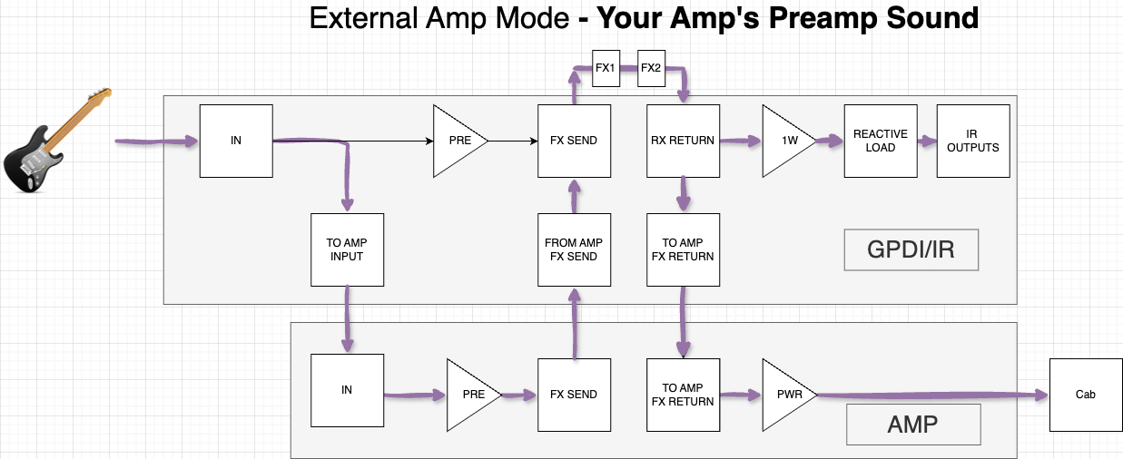 The IR loader will always be fed by: Preamp → 1W Power Amp → IR/Analog Cab. Sim → Outputs (balanced/unbalanced). This can be your amp’s preamp when using External Amp mode.