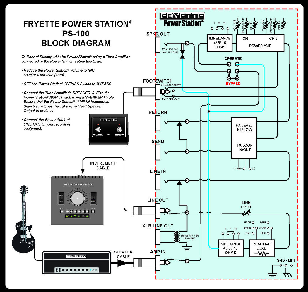 The line out is tapped directly from the reactive load. The line in is after that circuit. There will be a diagram below this. If you are not using the effects loop, you could use the effects send as an alternate “line out”. As long as nothing is plugged into the effects return, the signal continues on to the power amplification section.