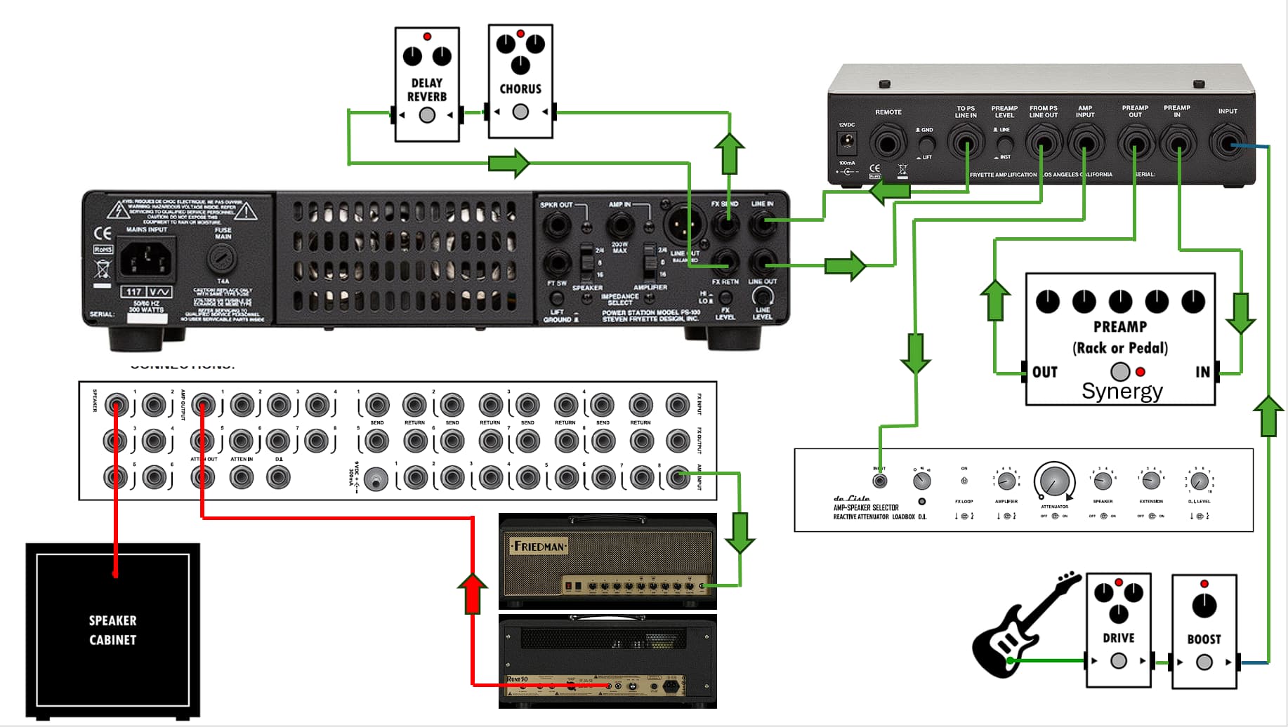 My thought is all I have to do is my Guitar (plus front end pedals) go to the INPUT of the Cyplos. All preamp connections go to my Synergy SYN 1/Cylops as normal. The AMP INPUT signal will them go to the INPUT of my Amp Switch. The AMP OUT of my Amp Switch will then go to the AMP IN of the PowerStation. Power Station SPEAKER OUT goes to my speaker cabinet. Does this signal routing seem correct?