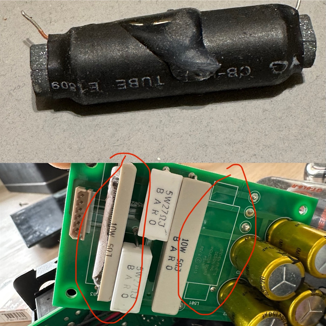 Hello! There was something lose inside my Ps1, i opened it and found that the cement cap on one baro 10w 5 ohm had fallen off. And also a bigger black resistor? Last one looks like something fryette have made, with heat shrink tube around, what is it?