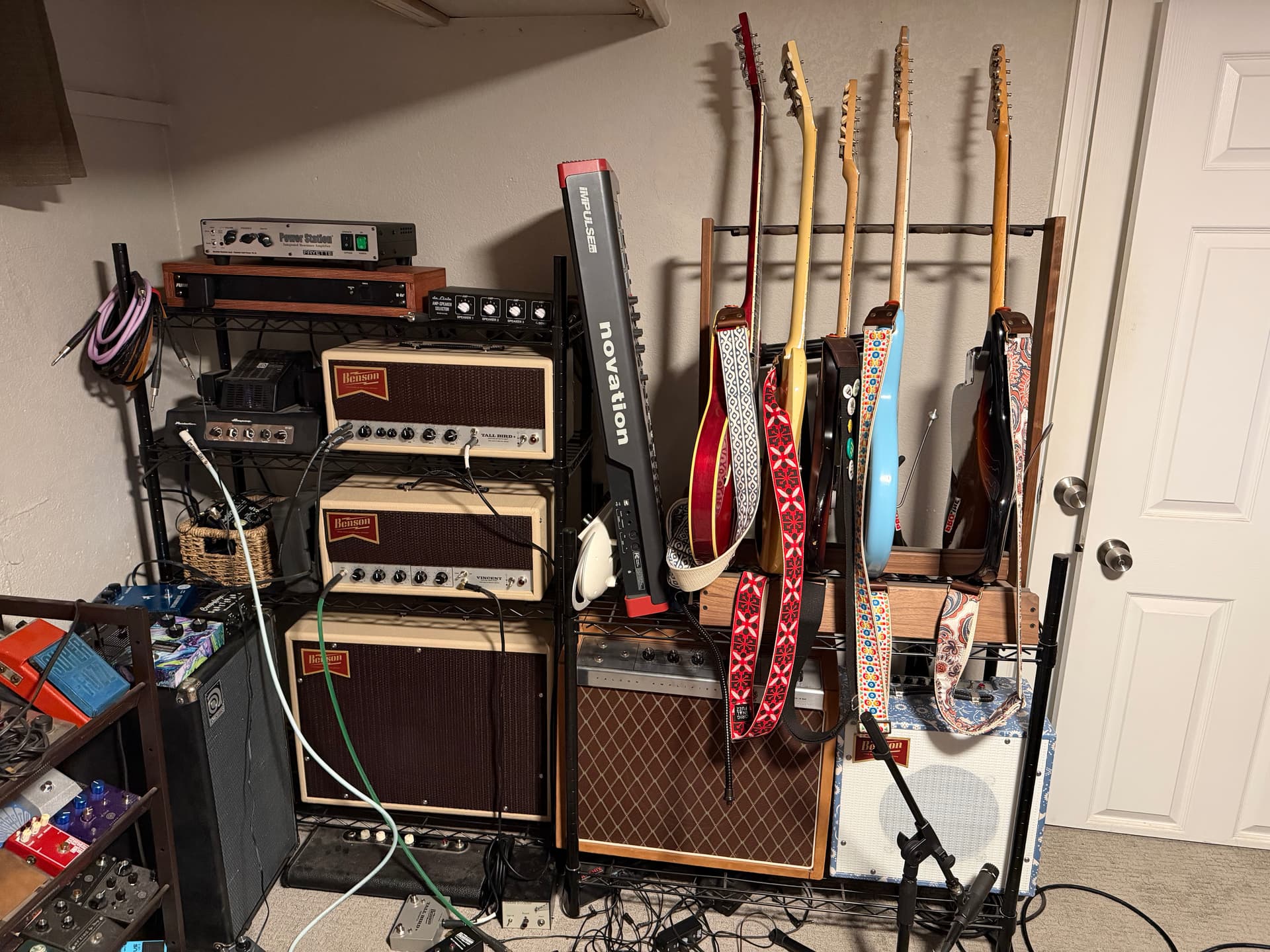 A bit (A LOT) messy. Have Benson Vincent, Gibson Falcon, and Ampeg PF-20T into PS-2A for silent recording. Now the Benson Cab, Falcon Speaker, and Ampeg 2x10 can be swapped in via switch. Benson Vinny Reverb for loud in my room.